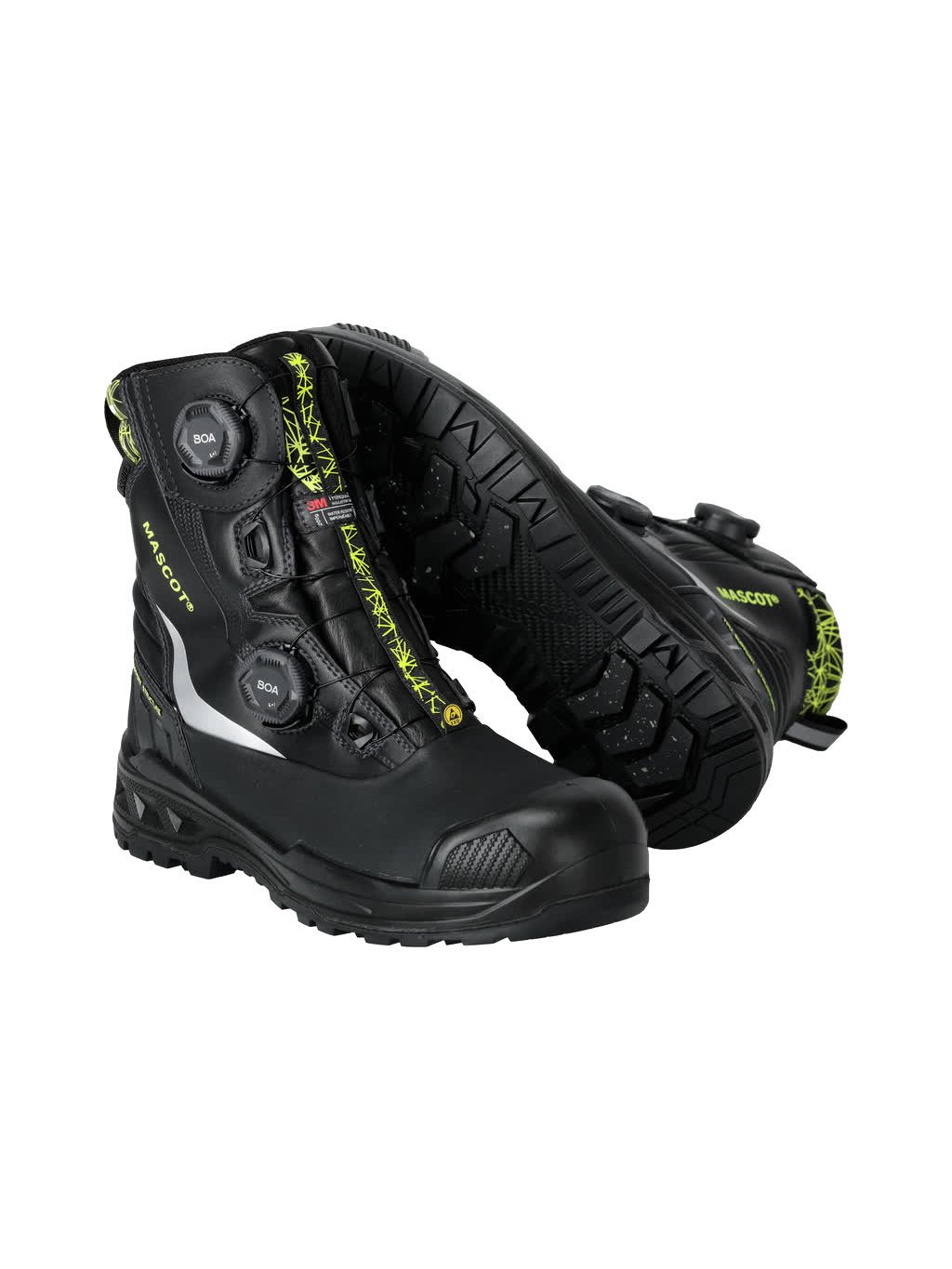 Zavírá se a otevírá pomocí systému BOA® Fit System, který se skládá z knoflíku, lana a vodítek tkaniček. Kompozitová špička. Textilní ochrana proti pronikání nehtů MASCOLAYER®. Se stabilizačním multifunkčním kloubem s integrovanou komfortní pěnou. Mezipodešev z PU. Pryžová podrážka s vložkami z třecí pryže. Stélky jsou vyměnitelné, antistatické a odolné proti opotřebení. Stélka tlumící nárazy. Vlhkost je absorbována a opět účinně uvolňována. Podrážka je odolná vůči olejům a benzínu. Podrážka je odolná vůči teplu až do 300 °C kontaktního tepla. Okraje podpatku. Izolační vnitřní podšívka se zateplením Thinsulate™. Voděodolná membrána z tkaniny MASCOTEX®. Vodoodpudivý a prodyšný svrchní materiál. Vhodné pro práci vkleče. Ochrana paty z TPU. Protiskluzová a samočistící podrážka zajišťuje stabilitu na všech površích. Neznačící podrážka - neodírá se.