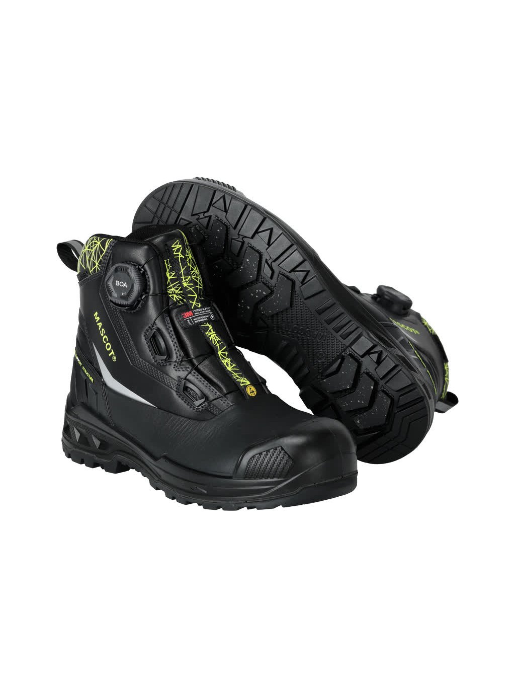 Zavírá se a otevírá pomocí systému BOA® Fit System, který se skládá z knoflíku, lana a vodítek tkaniček. Kompozitová špička. Textilní ochrana proti pronikání nehtů MASCOLAYER®. Tvarovaná ochrana špičky z TPU. Se stabilizačním multifunkčním kloubem s integrovanou komfortní pěnou. PU mezipodešev. Pryžová podrážka s vložkami z třecí pryže. Stélky jsou vyměnitelné, antistatické a odolné. Stélka tlumící nárazy. Vlhkost je absorbována a opět účinně uvolňována. Podrážka je odolná vůči olejům a benzínu. Podrážka je odolná vůči teplu až do 300 °C kontaktního tepla. Okraje podpatku. Izolační vnitřní podšívka se zateplením Thinsulate™. Voděodolná membrána z tkaniny MASCOTEX®. Vodoodpudivý a prodyšný svrchní materiál. Vhodné pro práci vkleče. Protiskluzová a samočistící podrážka zajišťuje stabilitu na všech površích. Neznačící podrážka - neodírá se.