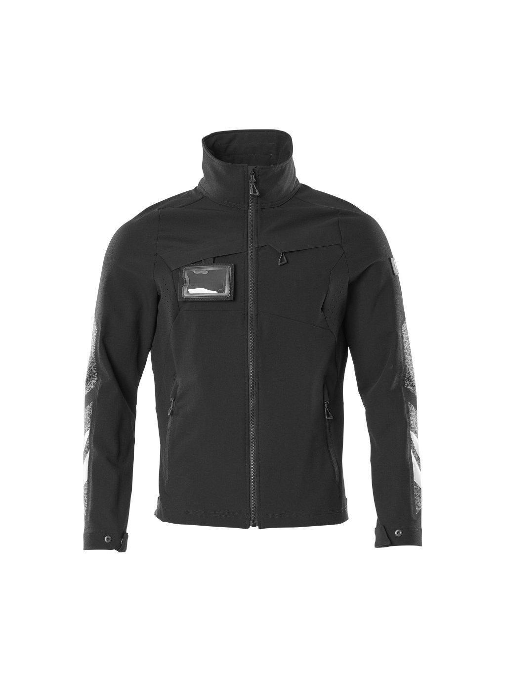 S vodoodpudivou úpravou. Ultimátní strečová tkanina s nízkou hmotností a dobrou odolností. Zapínání na zip a vnitřní ochranný pruh proti povětrnostním vlivům. Náprsní kapsa na zip. Odnímatelné pouzdro na průkaz totožnosti. Přední kapsy na zip. Nastavení na zápěstí a na spodním okraji pomocí stiskacích cvočků. S potiskem a reflexními detaily.