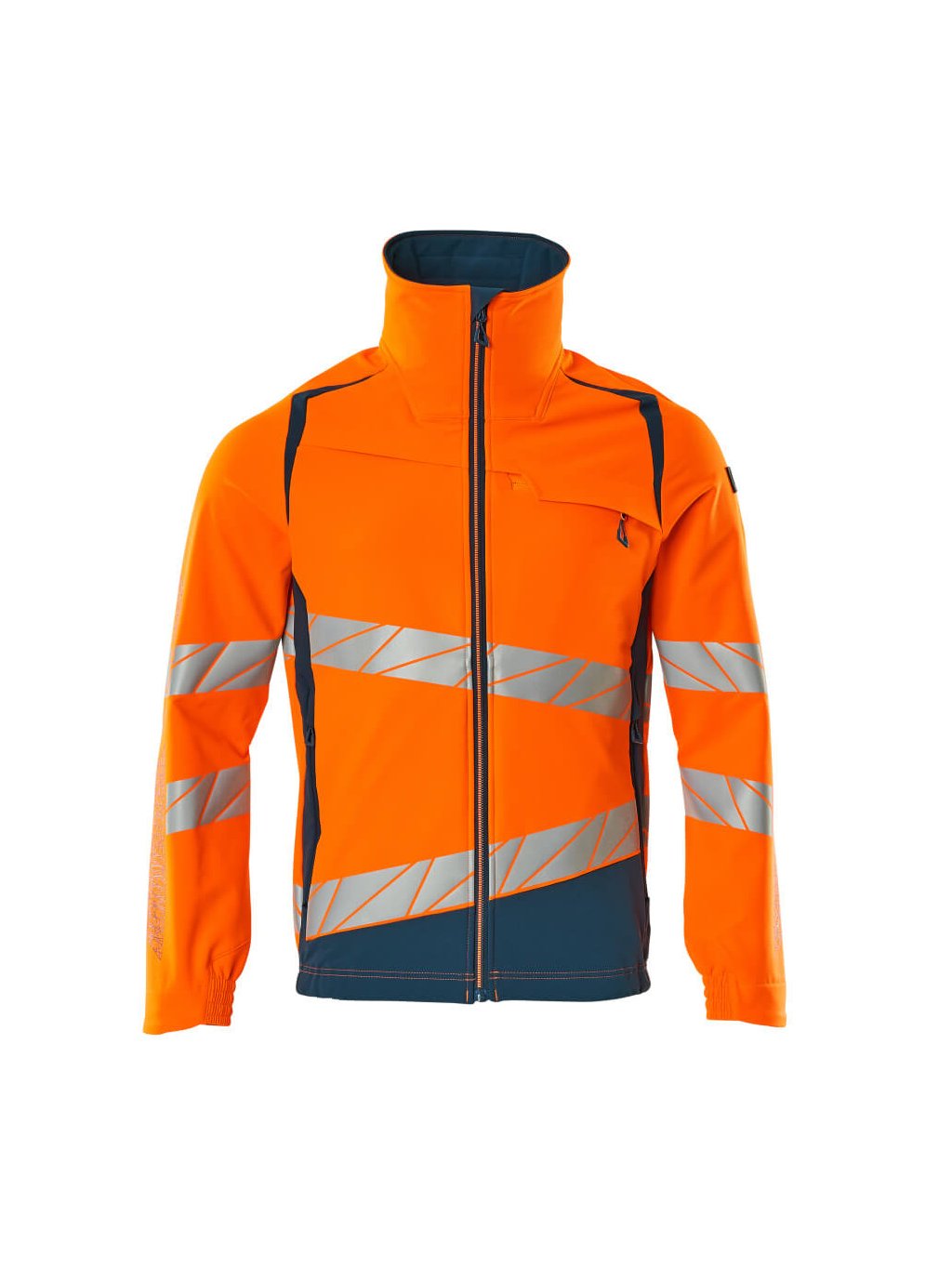Fluorescenční a s diagonálními odlesky. S vodoodpudivou úpravou. Ultimátní strečová tkanina s nízkou hmotností a dobrou odolností. Stojatý límec. Dvoubarevný. Zapínání na zip a vnitřní ochranný pruh proti povětrnostním vlivům. Připraveno pro připevnění pouzdra na průkaz totožnosti. Náprsní kapsa na zip. Přední kapsy na zip. Vnitřní kapsy. Elastický spodní okraj na bocích. Elastické zápěstí. Odvětrávání pod rukávy. S potiskem.