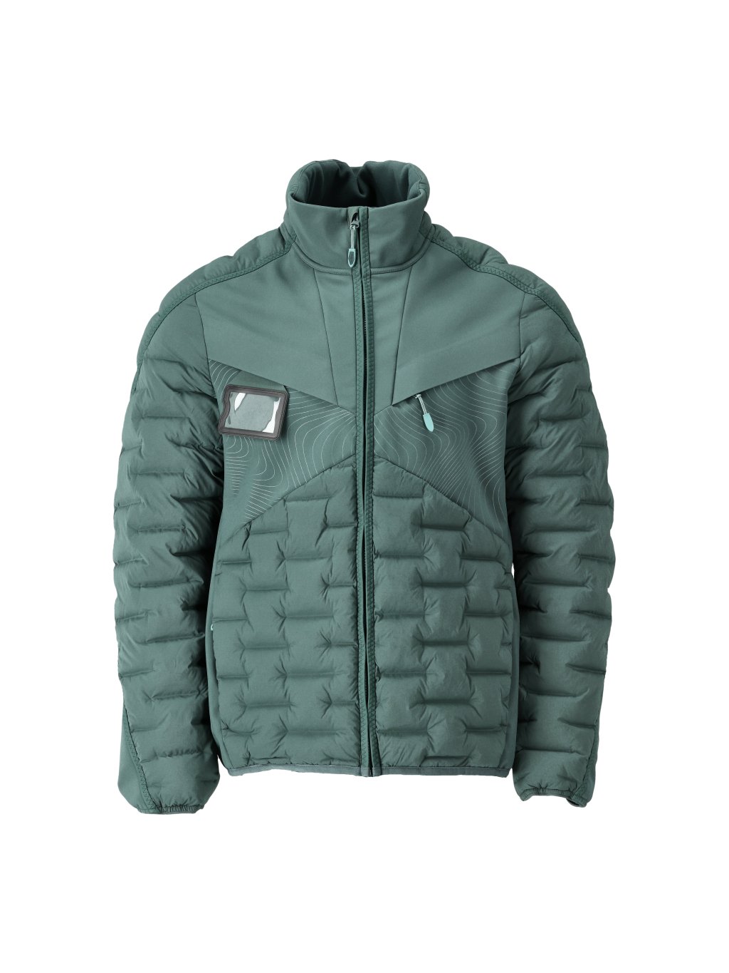 Prošívaná tkanina v metráži s elastickým materiálem. Prodyšná a vodoodpudivá. Moderní střih. Stojatý límec. Zapínání na zip. Vnitřní kapsa ze síťoviny. Náprsní kapsa na zip. Přední kapsy na zip. Odnímatelné pouzdro na průkaz totožnosti. Ergonomicky střižené rukávy umožňují velkou volnost pohybu. Elastické zápěstí a spodní lem. Reflexní efekty. Součástí balení jsou kuličky na sušení prádla v sušičce.