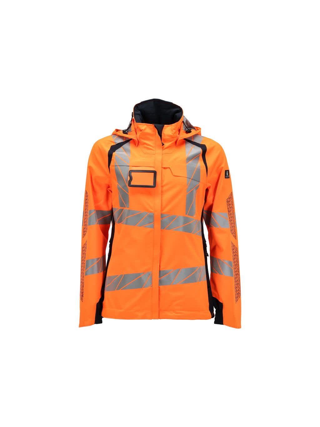 Dámský střih. Fluorescenční a s reflexními pruhy na ramenou a diagonálními reflexními prvky. Dvoubarevné. Vynikající prodyšné vlastnosti a také větru a voděodolnost. Podlepené švy. Kapuce je odnímatelná, podšitá a opatřená nastavitelnými elastickými šňůrkami. Zapínání na zip a dvojitý ochranný pruh proti povětrnostním vlivům. Vnitřní kapsy - dvě na zip a jedna otevřená síťovaná. Odnímatelné pouzdro na průkaz totožnosti. Přední kapsy s voděodolnými zipy. Stojatý límec. Žebrovaný pas vpředu, spodní vnitřní lem. Prodloužený zadní díl se zapínáním na knoflíky pro lepší ochranu proti větru a povětrnostním vlivům. Elastické zápěstí. S potiskem.