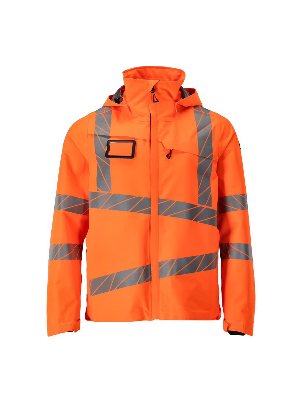 Fluorescenční a s reflexními pruhy na ramenou a diagonálními reflexními prvky. Vysoce odolná, prodyšná, větruodolná a nepromokavá tkanina. Švy jsou podlepené. Kapuce je odnímatelná, podšitá a opatřená nastavitelnými elastickými šňůrkami. Zapínání na zip a dvojitý ochranný pruh proti povětrnostním vlivům. Vnitřní kapsy - dvě na zip a jedna otevřená síťovaná. Odnímatelné pouzdro na průkaz totožnosti. Náprsní kapsa na zip. Přední kapsy na zip. Stojatý límec. Žebrovaný pas vpředu, spodní vnitřní lem. Rozšiřitelná zadní část na knoflíky pro lepší ochranu před větrem a nepříznivým počasím. Žebrované manžety (skryté pod nápletem chránícím před povětrnostními vlivy) na zápěstí. Zapínání na suchý zip na zápěstí.