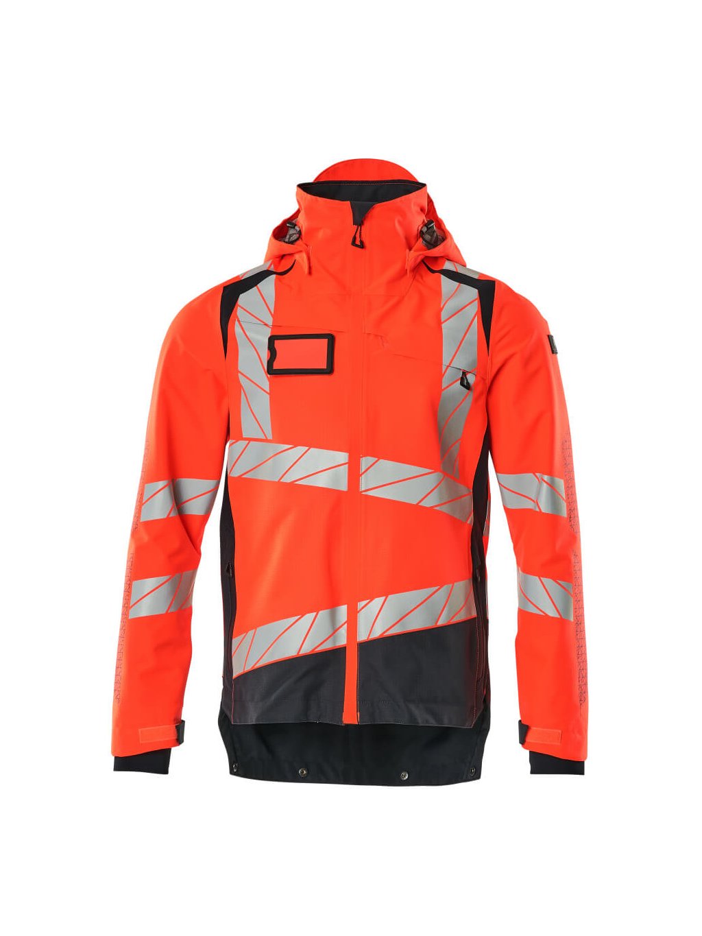 Fluorescenční a s reflexními pruhy na ramenou a diagonálními reflexními prvky. Vysoce odolná, prodyšná, větruodolná a nepromokavá tkanina. Švy jsou podlepené. Kapuce je odnímatelná, podšitá a opatřená nastavitelnými elastickými šňůrkami. Zapínání na zip a dvojitý ochranný pruh proti povětrnostním vlivům. Vnitřní kapsy - dvě na zip a jedna otevřená síťovaná. Odnímatelné pouzdro na průkaz totožnosti. Náprsní kapsa s voděodolným zipem. Přední kapsy s voděodolnými zipy. Stojatý límec. Žebrovaný pas na přední straně, spodní vnitřní lem. Rozšiřitelný zadní díl na knoflíky pro lepší ochranu před větrem a nepříznivým počasím. Žebrované manžety (skryté pod légou proti povětrnostním vlivům) na zápěstí. Zapínání na suchý zip na zápěstí. S potiskem.