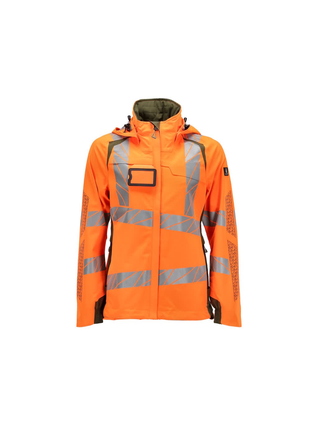Dámský střih. Fluorescenční a s reflexními pruhy na ramenou a diagonálními reflexními prvky. Dvoubarevné. Vynikající prodyšné vlastnosti a také větru a voděodolnost. Podlepené švy. Kapuce je odnímatelná, podšitá a opatřená nastavitelnými elastickými šňůrkami. Zapínání na zip a dvojitý ochranný pruh proti povětrnostním vlivům. Vnitřní kapsy - dvě na zip a jedna otevřená síťovaná. Odnímatelné pouzdro na průkaz totožnosti. Přední kapsy s voděodolnými zipy. Stojatý límec. Žebrovaný pas vpředu, spodní vnitřní lem. Prodloužený zadní díl se zapínáním na knoflíky pro lepší ochranu proti větru a povětrnostním vlivům. Elastické zápěstí. S potiskem.
