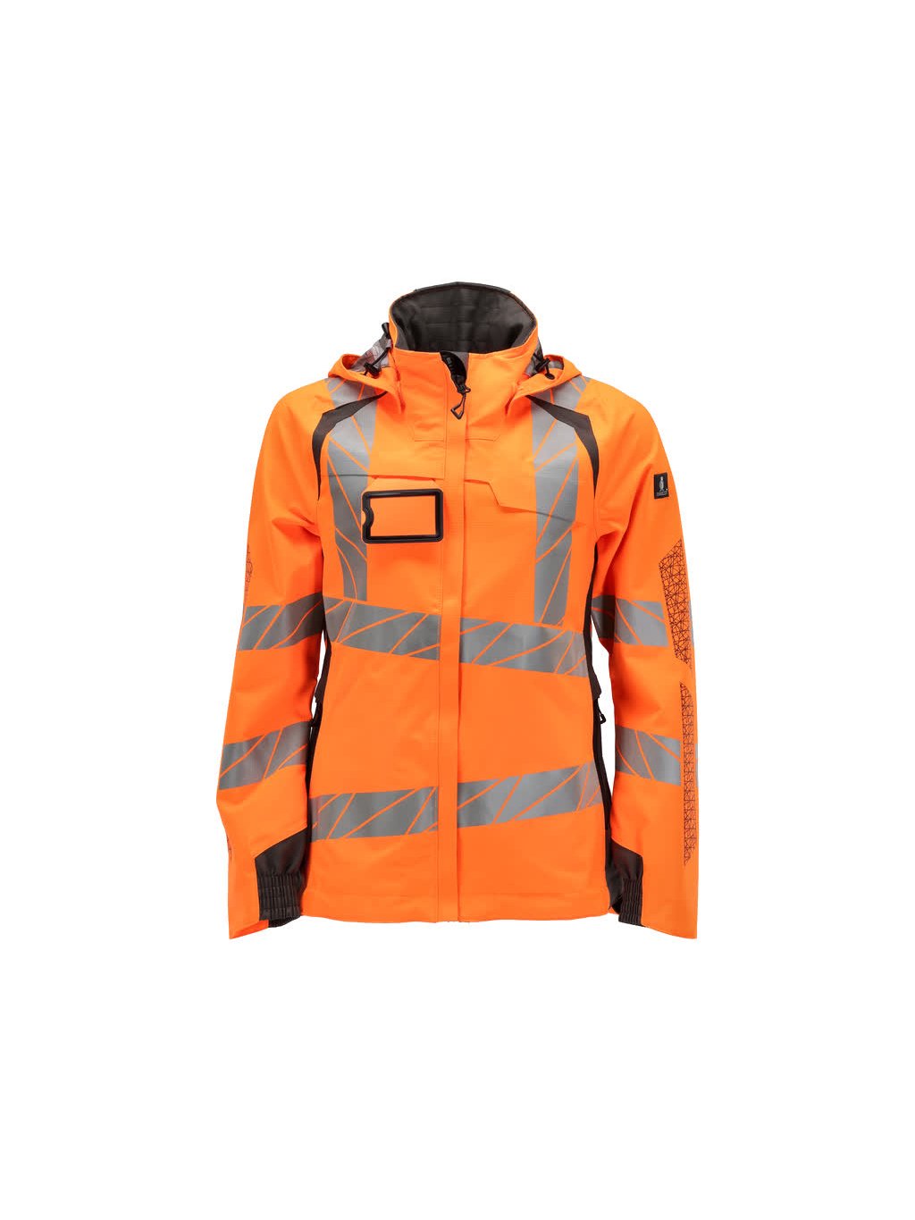 Dámský střih. Fluorescenční a s reflexními pruhy na ramenou a diagonálními reflexními prvky. Dvoubarevné. Vynikající prodyšné vlastnosti a také větru a voděodolnost. Podlepené švy. Kapuce je odnímatelná, podšitá a opatřená nastavitelnými elastickými šňůrkami. Zapínání na zip a dvojitý ochranný pruh proti povětrnostním vlivům. Vnitřní kapsy - dvě na zip a jedna otevřená síťovaná. Odnímatelné pouzdro na průkaz totožnosti. Přední kapsy s voděodolnými zipy. Stojatý límec. Žebrovaný pas vpředu, spodní vnitřní lem. Prodloužený zadní díl se zapínáním na knoflíky pro lepší ochranu proti větru a povětrnostním vlivům. Elastické zápěstí. S potiskem.