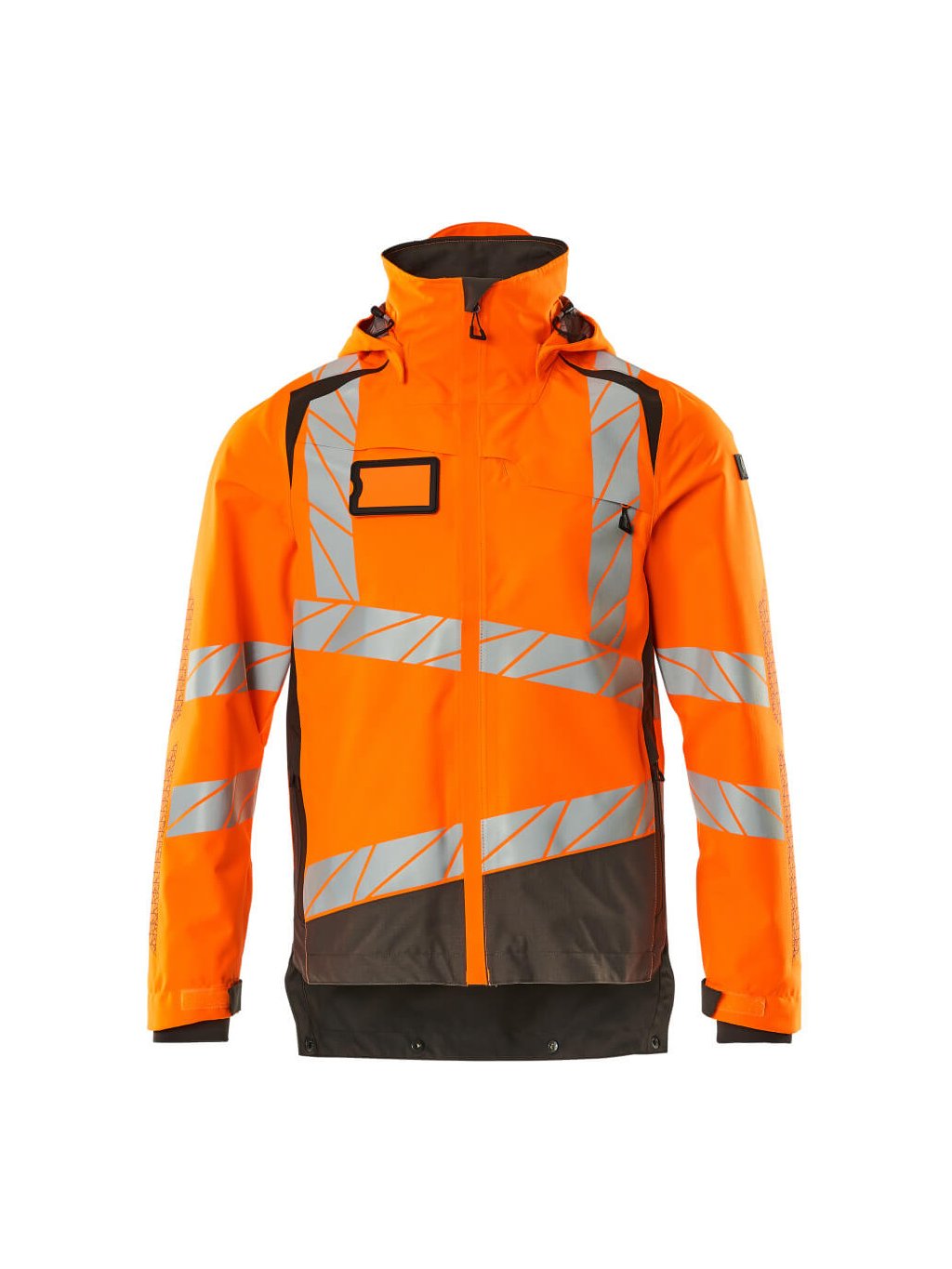 Fluorescenční a s reflexními pruhy na ramenou a diagonálními reflexními prvky. Vysoce odolná, prodyšná, větruodolná a nepromokavá tkanina. Švy jsou podlepené. Kapuce je odnímatelná, podšitá a opatřená nastavitelnými elastickými šňůrkami. Zapínání na zip a dvojitý ochranný pruh proti povětrnostním vlivům. Vnitřní kapsy - dvě na zip a jedna otevřená síťovaná. Odnímatelné pouzdro na průkaz totožnosti. Náprsní kapsa s voděodolným zipem. Přední kapsy s voděodolnými zipy. Stojatý límec. Žebrovaný pas na přední straně, spodní vnitřní lem. Rozšiřitelný zadní díl na knoflíky pro lepší ochranu před větrem a nepříznivým počasím. Žebrované manžety (skryté pod légou proti povětrnostním vlivům) na zápěstí. Zapínání na suchý zip na zápěstí. S potiskem.