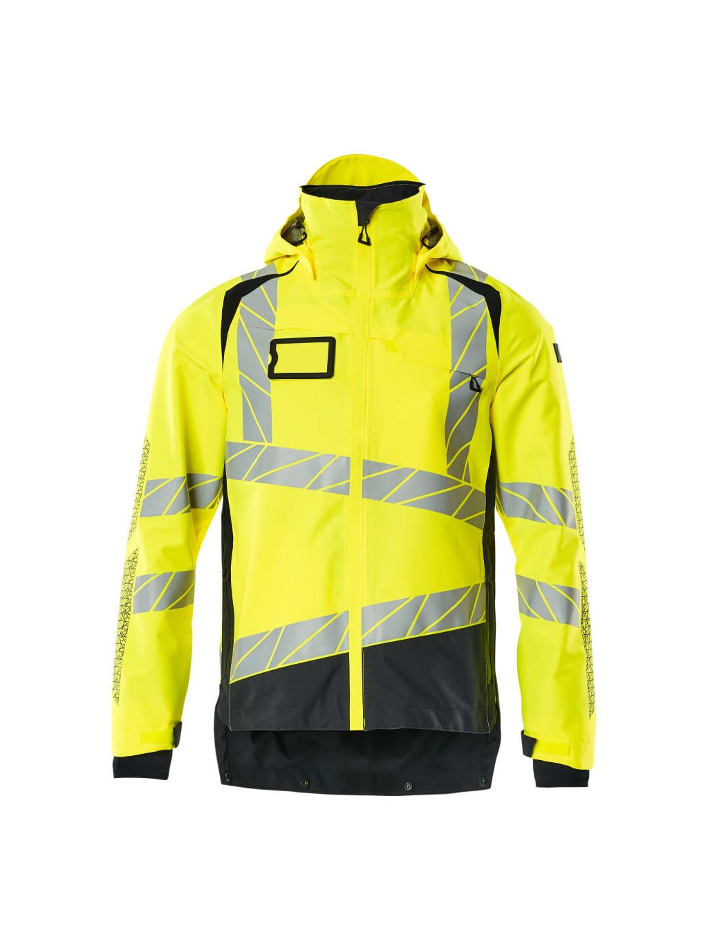 Fluorescenční a s reflexními pruhy na ramenou a diagonálními reflexními prvky. Vysoce odolná, prodyšná, větruodolná a nepromokavá tkanina. Švy jsou podlepené. Kapuce je odnímatelná, podšitá a opatřená nastavitelnými elastickými šňůrkami. Zapínání na zip a dvojitý ochranný pruh proti povětrnostním vlivům. Vnitřní kapsy - dvě na zip a jedna otevřená síťovaná. Odnímatelné pouzdro na průkaz totožnosti. Náprsní kapsa s voděodolným zipem. Přední kapsy s voděodolnými zipy. Stojatý límec. Žebrovaný pas na přední straně, spodní vnitřní lem. Rozšiřitelný zadní díl na knoflíky pro lepší ochranu před větrem a nepříznivým počasím. Žebrované manžety (skryté pod légou proti povětrnostním vlivům) na zápěstí. Zapínání na suchý zip na zápěstí. S potiskem.