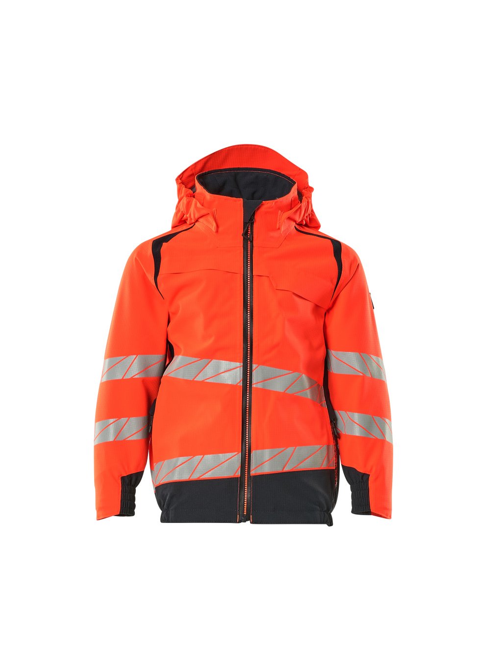 Dvoubarevné. Fluorescenční a s diagonálními odlesky. Vynikající prodyšné vlastnosti a odolnost proti větru a vodě. Podlepené švy. Odnímatelná, podšitá kapuce s elastickou vložkou. Zapínání na zip a pásek chránící před povětrnostními vlivy. Přední kapsy na zip. Elastické zápěstí. Elastický spodní okraj na bocích.
