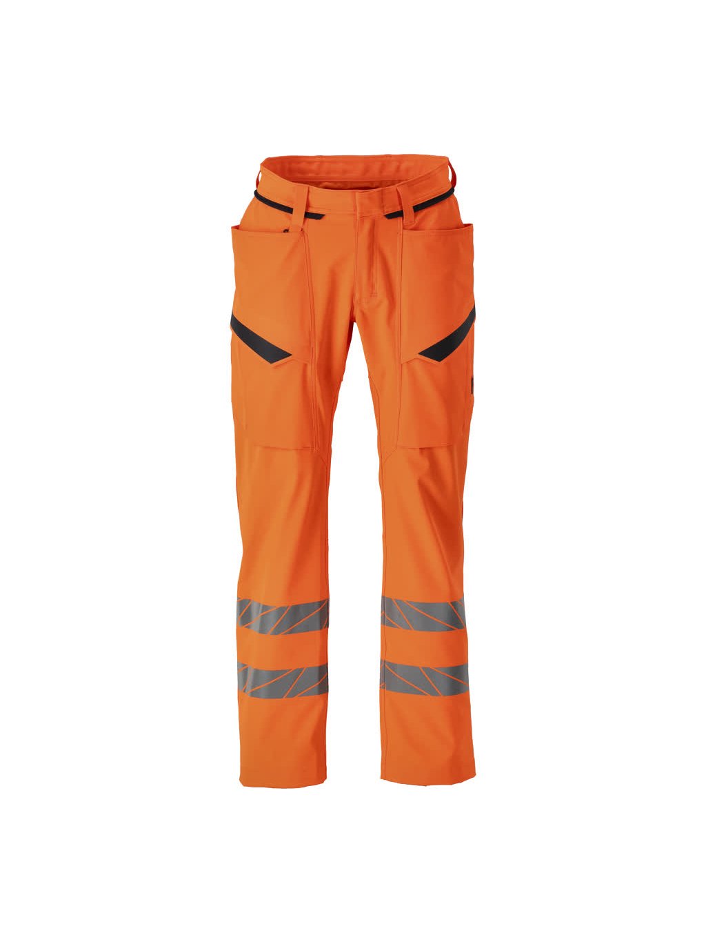 Fluorescenční s vertikální a horizontální reflexní páskou. Ultimátní strečová tkanina s nízkou hmotností a dobrou odolností. Polyester je vyroben z recyklovaných materiálů. S vodoodpudivou úpravou. Dvojité prošití na nohavicích a v rozkroku. Skryté zapínání na knoflíky. Zapínání na zip. Příprava pro zavěšení kapes s kapesním systémem click pocket. Poutka na opasek. Přední kapsy. Vyztužené zadní kapsy. Přední stehenní kapsy s klopou. Délku nohavic lze prodloužit o 3 cm rozpletením červeného švu na vnitřní straně konce nohavic.