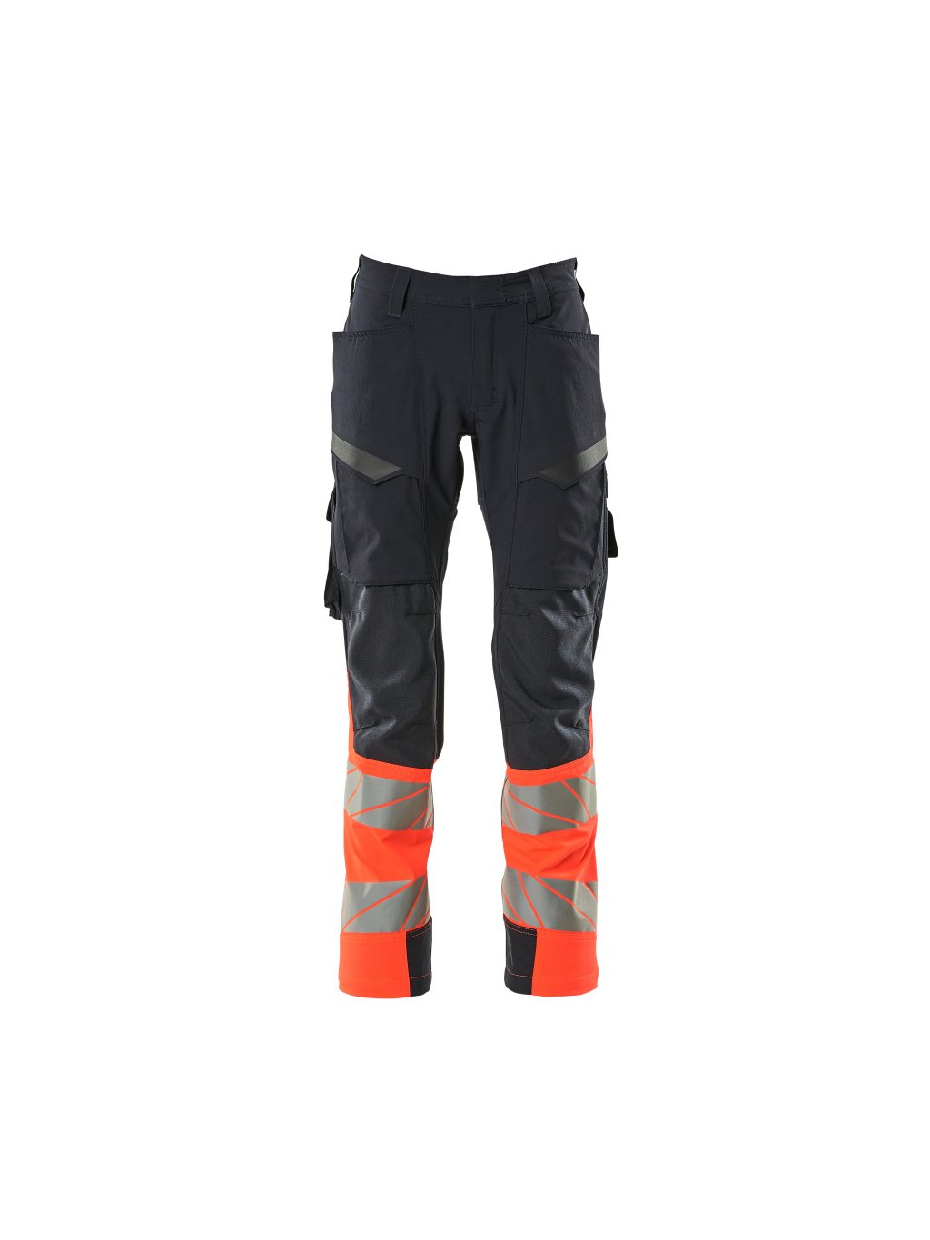 Fluorescenční kontrastní barva a reflexní prvky. Polyester je vyroben z recyklovaných materiálů. S vodoodpudivou úpravou. Dvoubarevné. Lehká. Ultimátní strečová tkanina, která je mimořádně lehká a odolná. Dvojité prošití na nohavicích a v rozkroku. Skryté zapínání na knoflíky. Ergonomicky tvarované nohavice. Poutka na pásek. Zapínání na zip. Přední kapsy. Zesílené zadní kapsy. Přední stehenní kapsy s klopou. Stehenní kapsa s kapsou na mobilní telefon, klopou a skrytým drukem a integrovaným pouzdrem na průkaz totožnosti. Pouzdro na průkaz totožnosti je odnímatelné. Stehenní kapsa s prostorem pro ruční skener. Zesílení CORDURA® (1000 D) na kolenou. S potiskovými efekty. Délku rozkroku lze prodloužit o 3 cm rozepnutím červeného švu na vnitřní straně konce nohavice.