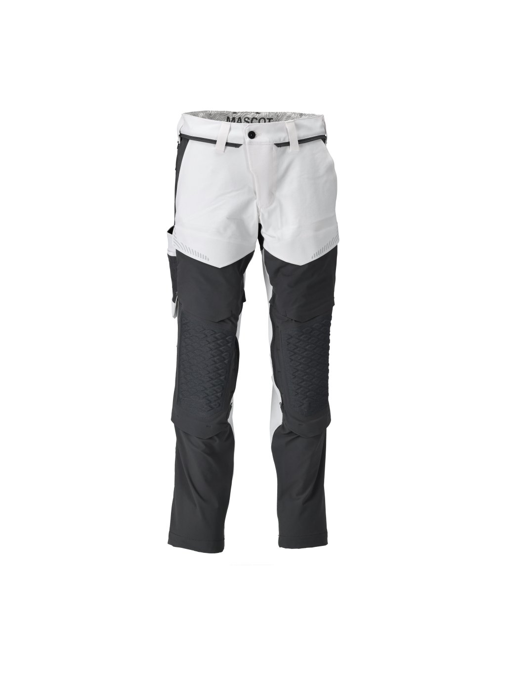 Vyvinuté se zaměřením na malířství, např. ve formě speciálních kapes. Ultimátní strečová tkanina s nízkou hmotností a vysokou odolností. S vodoodpudivou úpravou. Připraveno pro zavěšení kapes pomocí systému Click Pocket. Dvojité a trojité prošití na nohavicích a v rozkroku. Nohavice kalhot jsou ergonomicky tvarované. Větrací otvory v zadní části kolen a v zadní části pasu. Poutka na opasek. Poklopec se zipem. Větrací síťovina se zipem na bocích. Přední kapsy. Dvě zadní kapsy, jedna s klopou. Otevřená kapsa na boku stehna s malou vnější kapsou s prostorem pro štětec. Kapsa na stehně s přihrádkou na mobilní telefon, magnetickým zapínáním a integrovaným pouzdrem na průkaz totožnosti. Pouzdro na průkaz totožnosti je odnímatelné. Kapsy s klopou na přední straně stehna. Nastavitelné a odvětrávané kolenní kapsy z vysoce odolného materiálu CORDURA®. Jednoduché a individuální nastavení výšky kolenních kapes. Délku rozkroku lze prodloužit o 3 cm rozepnutím červeného švu na vnitřní straně konce nohavice. Reflexní efekty. K tomuto modelu doporučujeme následující ochranu kolen: 00418-100, 00718-100 nebo 20118-915. Certifikováno společně s chráničem kolen typu SHORT nebo LONG podle normy EN 14404.