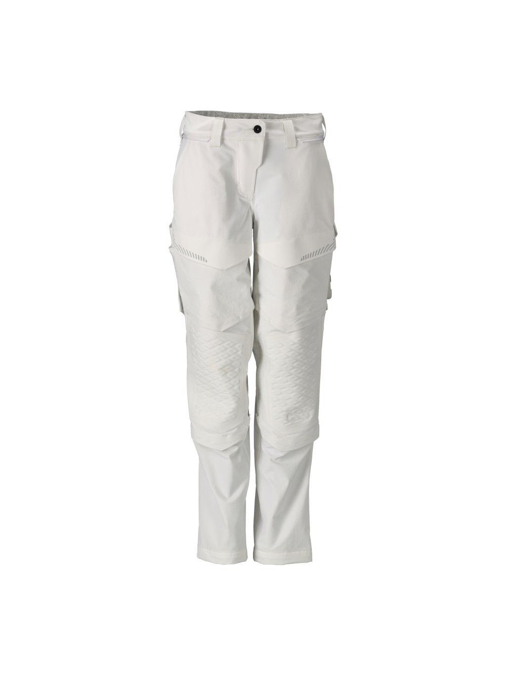 Dámský střih DIAMOND. Vyvinuto se zaměřením na malířské řemeslo, např. v podobě speciálních kapes. Ultimátní strečová tkanina s nízkou hmotností a vysokou odolností. S vodoodpudivou úpravou. Připraveno pro zavěšení kapes pomocí systému Click Pocket. Dvojité a trojité prošití na nohavicích a v rozkroku. Nohavice kalhot jsou ergonomicky tvarované. Větrací otvory v zadní části kolen a v zadní části pasu. Poutka na opasek. Zapínání na zip. Větrací síťovina se zipem na bocích. Přední kapsy. Dvě zadní kapsy, jedna s klopou. Otevřená kapsa na boku stehna s malou vnější kapsou s prostorem pro štětec. Kapsa na stehně s přihrádkou na mobilní telefon, magnetickým zapínáním a integrovaným pouzdrem na průkaz totožnosti. Pouzdro na průkaz totožnosti je odnímatelné. Kapsy s klopou na přední straně stehna. Nastavitelné a odvětrávané kolenní kapsy z vysoce odolného materiálu CORDURA®. Jednoduché a individuální nastavení výšky kolenních kapes. Délku rozkroku lze prodloužit o 3 cm rozepnutím červeného švu na vnitřní straně konce nohavice. Reflexní efekty. K tomuto modelu doporučujeme následující ochranu kolen: 00418-100, 00718-100 nebo 20118-915. Certifikováno společně s chráničem kolen typu SHORT nebo LONG podle normy EN 14404.