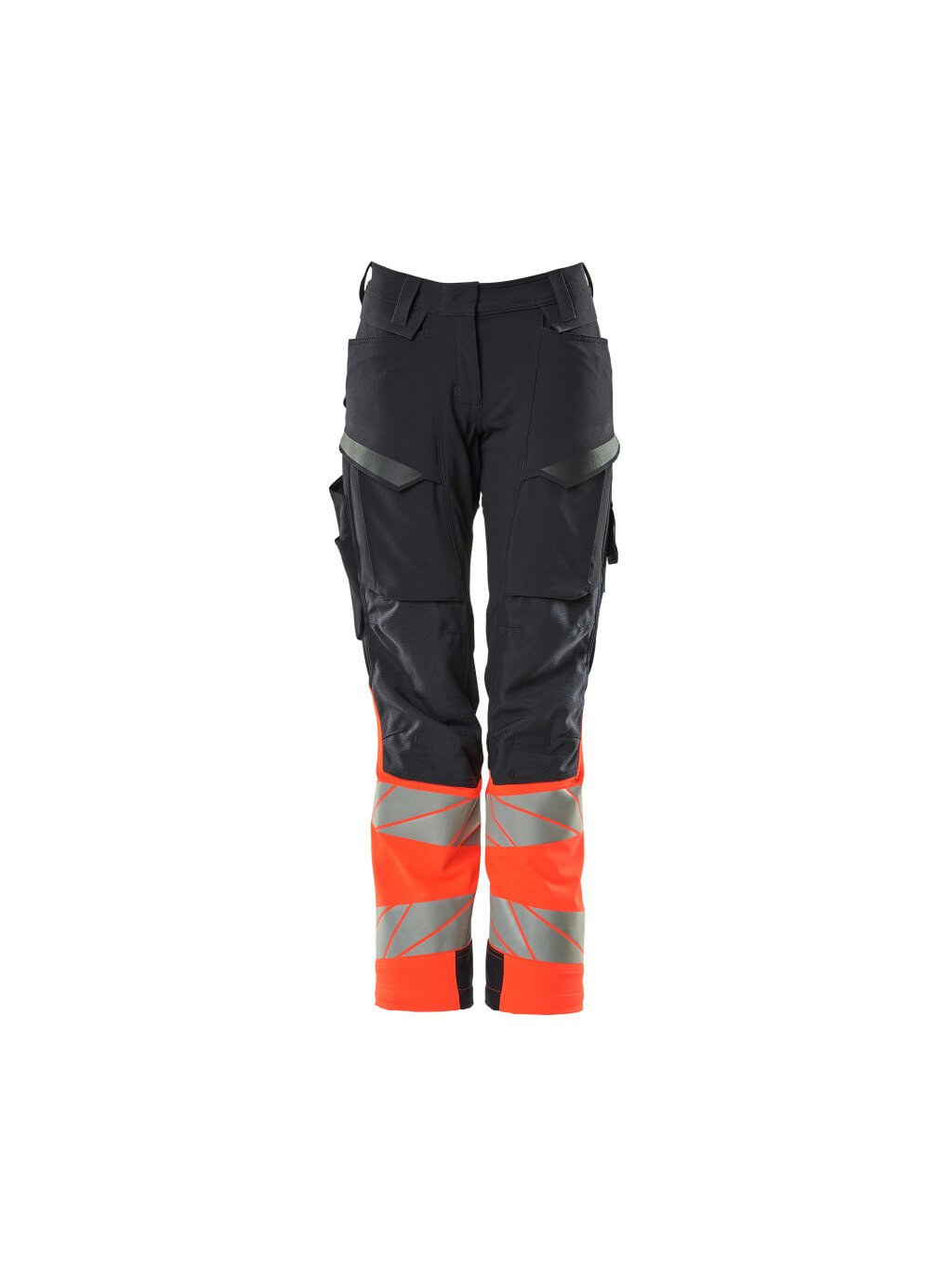 Dámský fit DIAMOND. Fluorescenční kontrastní barva s odlesky. S vodoodpudivou úpravou. Dvoubarevné. Ultimátní strečová tkanina s nízkou hmotností a dobrou odolností. Dvojité prošití na nohavicích a v rozkroku. Skryté zapínání na knoflíky. Zapínání na zip. Poutka na pásek. Ergonomicky tvarované nohavice. Přední kapsy. Zesílené zadní kapsy. Skryté poutko na kladivo na pravé straně. Příprava pro závěsné kapsy 19450-126, které se zapínají na knoflíky. Sklopná kapsa na pravidla s kevlarovými® výztuhami. Kapsy s klopou na předním stehně. Kapsy na kolenou ze superodolné CORDURY® (1000 D), výškově nastavitelné. Jednoduché a individuální nastavení výšky kolenních kapes. Stehenní kapsa s podšívkou na mobilní telefon, skrytým zapínáním na druk a integrovaným pouzdrem na průkaz totožnosti. Pouzdro na průkaz totožnosti je odnímatelné. Svislý zip pro větrání na zadní straně stehna. S potiskem efektů. Délku rozkroku lze prodloužit o 3 cm rozepnutím červeného švu na vnitřní straně konce nohavice. K tomuto modelu doporučujeme následující ochranu kolen: 00418-100, 00718-100, 50451-916 nebo 20118-915. Certifikováno společně s chráničem kolen typu SHORT nebo LONG podle normy EN 14404.