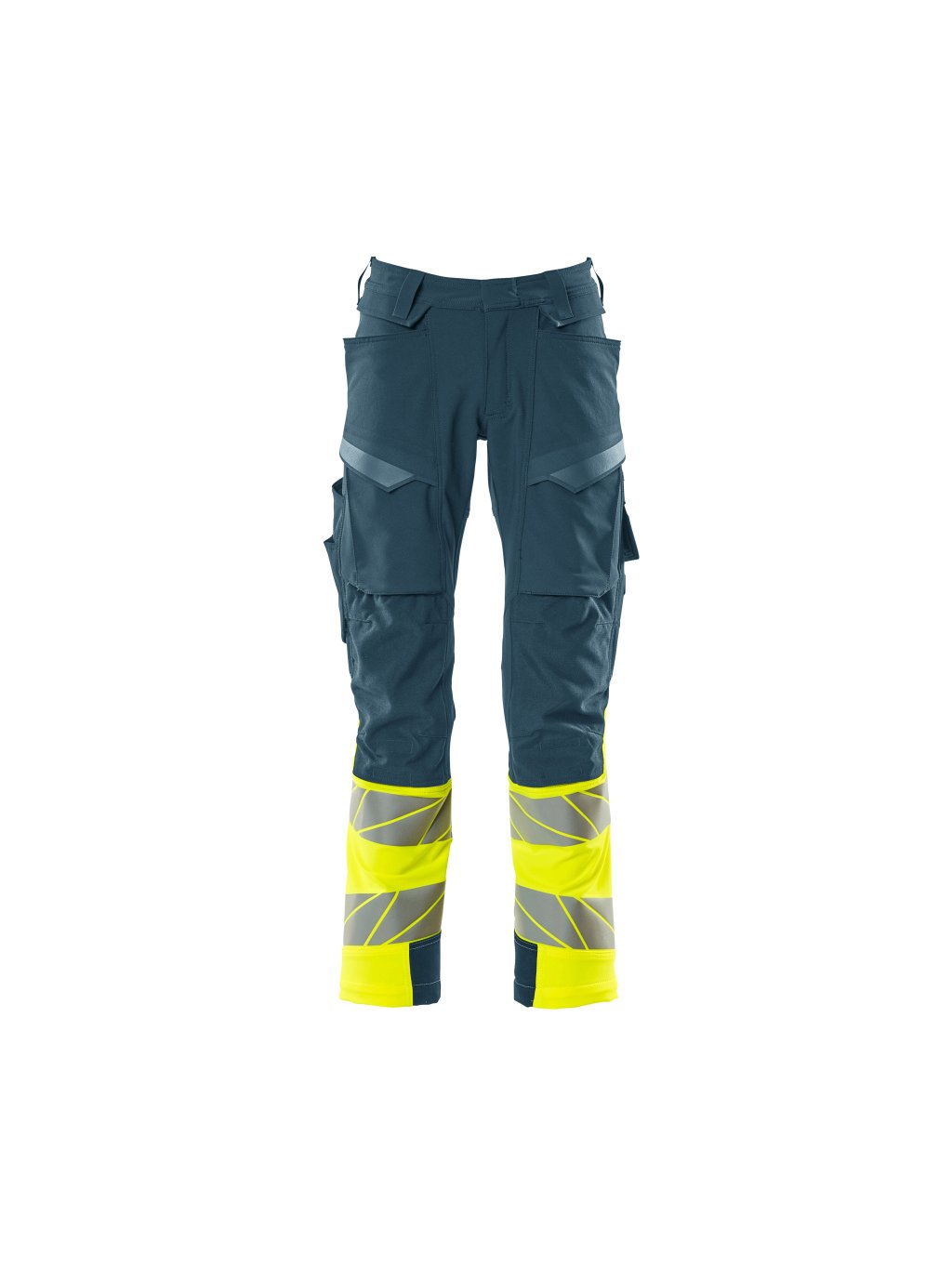 Fluorescenční kontrastní barva a odlesky. S vodoodpudivou úpravou. Dvoubarevné. Ultimátní strečová tkanina s nízkou hmotností a dobrou odolností. Dvojité prošití na nohavicích a v rozkroku. Skryté zapínání na knoflíky. Ergonomicky tvarované nohavice. Poutka na pásek. Zapínání na zip. Přední kapsy. Zesílené zadní kapsy. Skryté poutko na kladivo na pravé straně. Příprava pro závěsné kapsy 19450-126, které se zapínají na knoflíky. Sklopná kapsa na pravidla s kevlarovými® výztuhami. Kapsy s klopou na předním stehně. Kapsy na kolenou ze superodolné CORDURY® (1000 D), výškově nastavitelné. Jednoduché a individuální nastavení výšky kolenních kapes. Stehenní kapsa s podšívkou na mobilní telefon, skrytým zapínáním na druk a integrovaným pouzdrem na průkaz totožnosti. Pouzdro na průkaz totožnosti je odnímatelné. Svislý zip pro větrání na zadní straně stehna. S potiskem efektů. Délku rozkroku lze prodloužit o 3 cm rozepnutím červeného švu na vnitřní straně konce nohavice. K tomuto modelu doporučujeme následující ochranu kolen: 00418-100, 00718-100, 50451-916 nebo 20118-915. Certifikováno společně s chráničem kolen typu SHORT nebo LONG podle normy EN 14404.