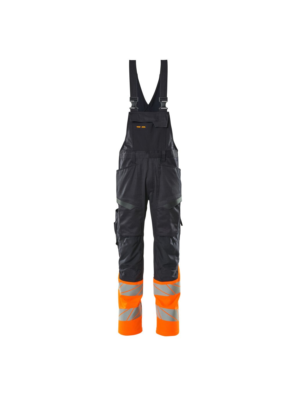 Fluorescenční kontrastní barva a odlesky. Dvoubarevné. Části výrobku jsou vyrobeny z elastické tkaniny. Kombinace lehké tkaniny kvality 236 a tkaniny ULTIMATE STRETCH kvality 511. Dvojité prošití na nohavicích a v rozkroku. Nohavice kalhot jsou ergonomicky tvarované. Látková ramínka, nastavitelná a s krátkým, pevným elastickým páskem a plastovými přezkami. Konce ramenních popruhů lze zastrčit pomocí malých poutek. Kapsa na náprsence s kapsou na tužky, kapsou na mobilní telefon a klopou se skrytými druky. Nastavitelný pas. Poutka na opasek. D-kroužek. Zapínání na zip. Přední kapsy. Zesílené zadní kapsy. Skryté poutko na kladivo na pravé straně. Vyztužená kapsa na skládací pravidla. Přední stehenní kapsy s klopou. Kolenní kapsy z odolného materiálu CORDURA® (500 D), výškově nastavitelné. Jednoduché a individuální nastavení výšky kolenních kapes. Stehenní kapsa s kapsou na mobilní telefon, klopou a skrytými druky. S potiskovými efekty. Délku rozkroku lze prodloužit o 3 cm rozepnutím červeného švu na vnitřní straně konce nohavice. K tomuto modelu doporučujeme následující ochranu kolen: 00418-100, 00718-100, 50451-916 nebo 20118-915. Certifikováno společně s chráničem kolen typu SHORT nebo LONG podle normy EN 14404.