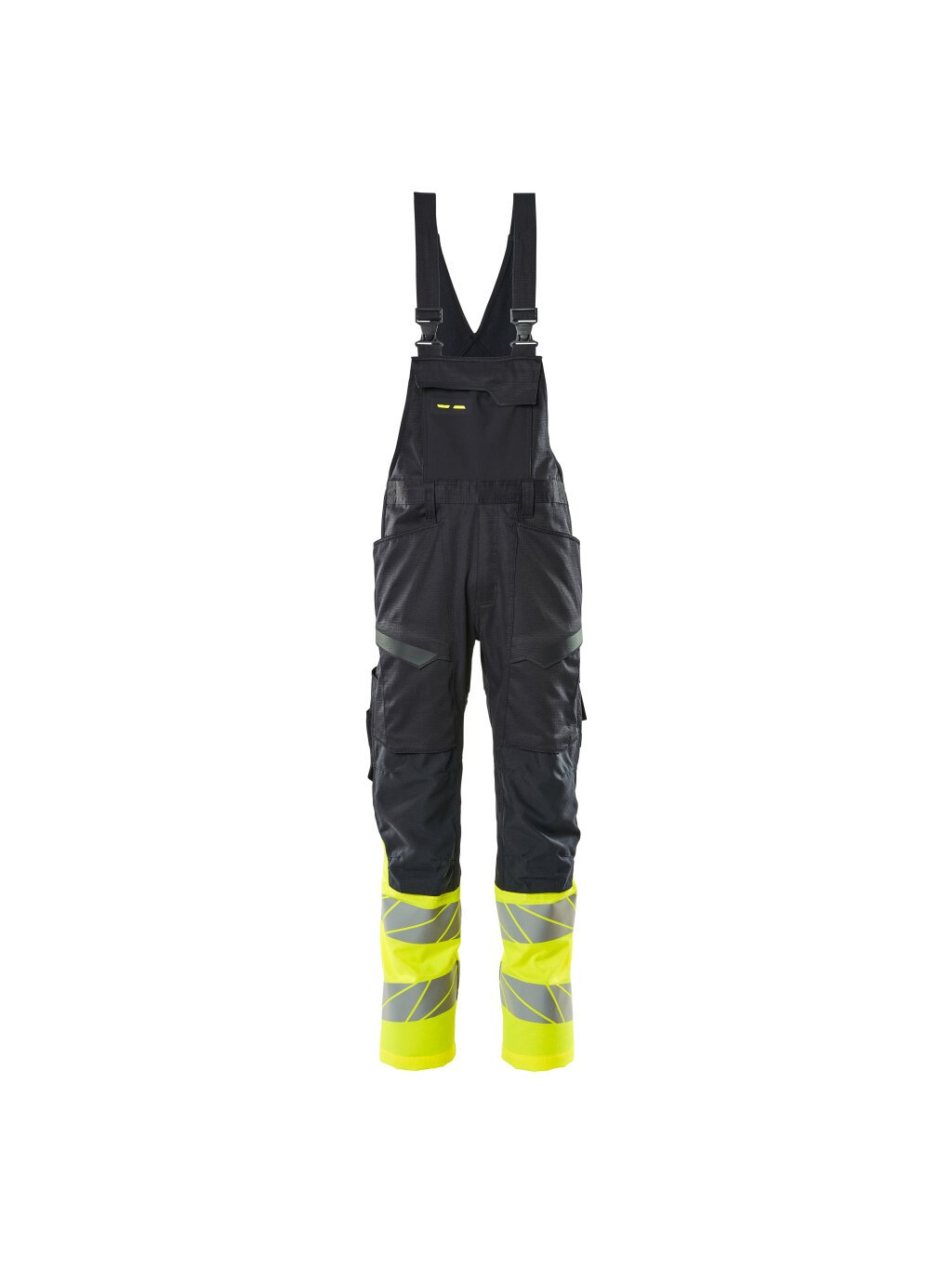 Fluorescenční kontrastní barva a odlesky. Dvoubarevné. Části výrobku jsou vyrobeny z elastické tkaniny. Kombinace lehké tkaniny kvality 236 a tkaniny ULTIMATE STRETCH kvality 511. Dvojité prošití na nohavicích a v rozkroku. Nohavice kalhot jsou ergonomicky tvarované. Látková ramínka, nastavitelná a s krátkým, pevným elastickým páskem a plastovými přezkami. Konce ramenních popruhů lze zastrčit pomocí malých poutek. Kapsa na náprsence s kapsou na tužky, kapsou na mobilní telefon a klopou se skrytými druky. Nastavitelný pas. Poutka na opasek. D-kroužek. Zapínání na zip. Přední kapsy. Zesílené zadní kapsy. Skryté poutko na kladivo na pravé straně. Vyztužená kapsa na skládací pravidla. Přední stehenní kapsy s klopou. Kolenní kapsy z odolného materiálu CORDURA® (500 D), výškově nastavitelné. Jednoduché a individuální nastavení výšky kolenních kapes. Stehenní kapsa s kapsou na mobilní telefon, klopou a skrytými druky. S potiskovými efekty. Délku rozkroku lze prodloužit o 3 cm rozepnutím červeného švu na vnitřní straně konce nohavice. K tomuto modelu doporučujeme následující ochranu kolen: 00418-100, 00718-100, 50451-916 nebo 20118-915. Certifikováno společně s chráničem kolen typu SHORT nebo LONG podle normy EN 14404.