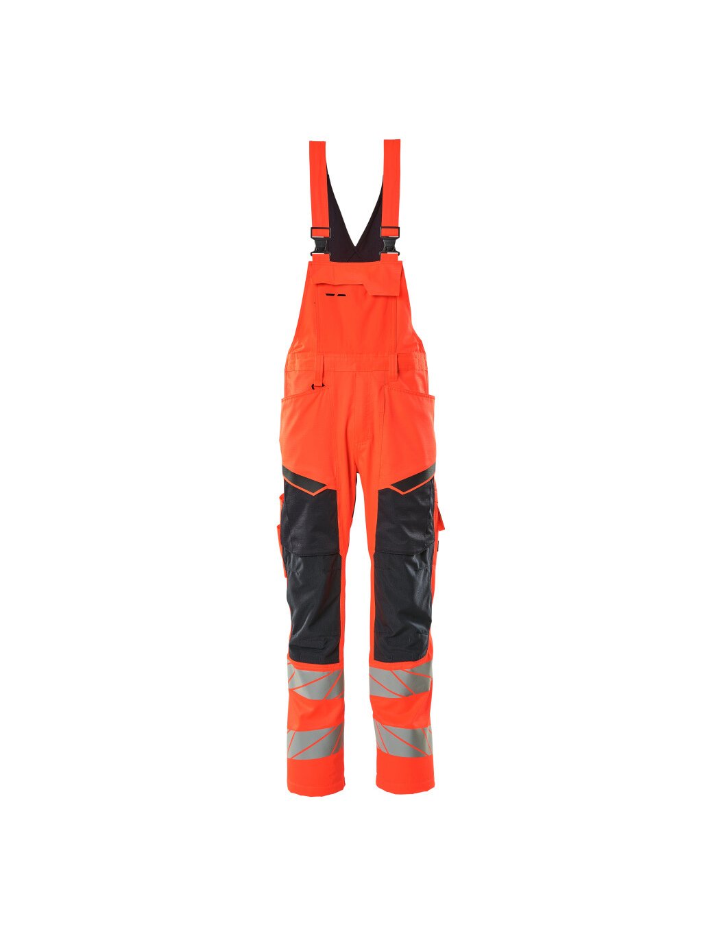 Fluorescenční s odlesky. Dvoubarevné. Části výrobku jsou vyrobeny z elastické tkaniny. Kombinace lehké tkaniny kvality 236 a tkaniny ULTIMATE STRETCH kvality 511. Dvojité prošití na nohavicích a v rozkroku. Nohavice kalhot jsou ergonomicky tvarované. Látková ramínka, nastavitelná a s krátkým, pevným elastickým páskem a plastovými přezkami. Konce ramenních popruhů lze zastrčit pomocí malých poutek. Kapsa na náprsence s kapsou na tužky, kapsou na mobilní telefon a klopou se skrytými druky. Nastavitelný pas. Poutka na opasek. D-kroužek. Zapínání na zip. Přední kapsy. Zesílené zadní kapsy. Skryté poutko na kladivo na pravé straně. Vyztužená kapsa na skládací pravidla. Přední stehenní kapsy s klopou. Kolenní kapsy z odolného materiálu CORDURA® (500 D), výškově nastavitelné. Jednoduché a individuální nastavení výšky kolenních kapes. Stehenní kapsa s kapsou na mobilní telefon, klopou a skrytými druky. S potiskovými efekty. Délku rozkroku lze prodloužit o 3 cm rozepnutím červeného švu na vnitřní straně konce nohavice. K tomuto modelu doporučujeme následující ochranu kolen: 00418-100, 00718-100, 50451-916 nebo 20118-915. Certifikováno společně s chráničem kolen typu SHORT nebo LONG podle normy EN 14404.