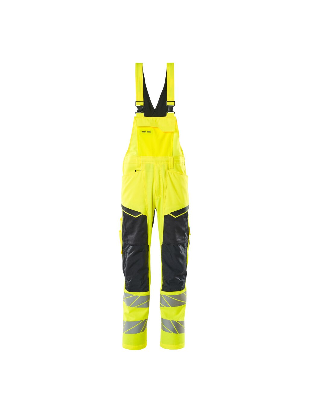 Fluorescenční s odlesky. Dvoubarevné. Části výrobku jsou vyrobeny z elastické tkaniny. Kombinace lehké tkaniny kvality 236 a tkaniny ULTIMATE STRETCH kvality 511. Dvojité prošití na nohavicích a v rozkroku. Nohavice kalhot jsou ergonomicky tvarované. Látková ramínka, nastavitelná a s krátkým, pevným elastickým páskem a plastovými přezkami. Konce ramenních popruhů lze zastrčit pomocí malých poutek. Kapsa na náprsence s kapsou na tužky, kapsou na mobilní telefon a klopou se skrytými druky. Nastavitelný pas. Poutka na opasek. D-kroužek. Zapínání na zip. Přední kapsy. Zesílené zadní kapsy. Skryté poutko na kladivo na pravé straně. Vyztužená kapsa na skládací pravidla. Přední stehenní kapsy s klopou. Kolenní kapsy z odolného materiálu CORDURA® (500 D), výškově nastavitelné. Jednoduché a individuální nastavení výšky kolenních kapes. Stehenní kapsa s kapsou na mobilní telefon, klopou a skrytými druky. S potiskovými efekty. Délku rozkroku lze prodloužit o 3 cm rozepnutím červeného švu na vnitřní straně konce nohavice. K tomuto modelu doporučujeme následující ochranu kolen: 00418-100, 00718-100, 50451-916 nebo 20118-915. Certifikováno společně s chráničem kolen typu SHORT nebo LONG podle normy EN 14404.