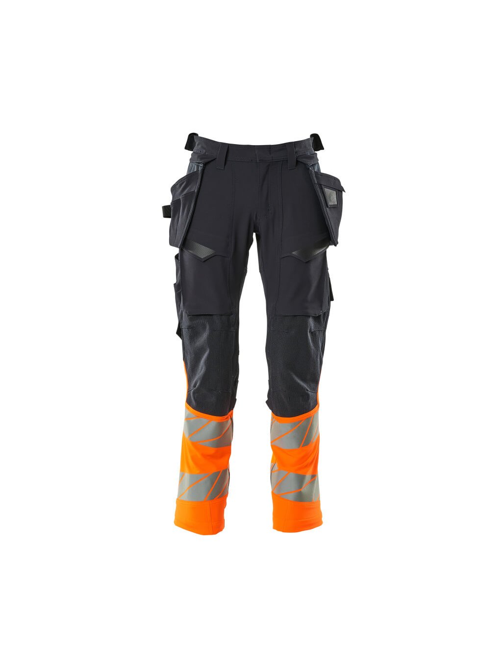 Strečová tkanina je pružná ve všech směrech a nabízí nepřekonatelnou volnost pohybu, kdy nic netáhne ani nepřekáží; Multifunkční strečová tkanina kombinuje nízkou hmotnost s velmi vysokou odolností a je také vodoodpudivá; Závěsné kapsy s výztuhami z tkaniny Kevlar® a CORDURA®; Odnímatelné závěsné kapsy; Účinné větrání na nohavicích prostřednictvím zipu na stehně.Sklopná kapsa na pravidla s výztuhami z Kevlaru® - obzvláště odolná vůči špičatým a ostrým předmětům; Kapsy na kolena z obousměrně strečové tkaniny CORDURA®, které poskytují dodatečnou volnost pohybu při klečení; Kapsy na kolena jsou výškově nastavitelné, takže ochrana kolen je optimálně umístěna na kolenou; Certifikováno pro použití společně s chráničem kolen MASCOT typu SHORT nebo LONG, protože kapsa na chránič kolen je výškově nastavitelná.