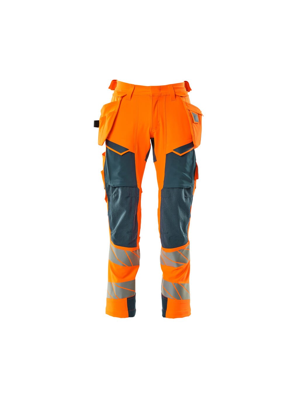 Fluorescenční s odlesky. S vodoodpudivou úpravou. Dvoubarevné. Ultimátní strečová tkanina s nízkou hmotností a dobrou odolností. Dvojité prošití na nohavicích a v rozkroku. Skryté zapínání na knoflíky. Ergonomicky tvarované nohavice. Odnímatelné závěsné kapsy. Vnitřní závěsná kapsa se zapínáním na patentku. Závěsná kapsa s podšívkou na mobilní telefon a magnetickým zapínáním. Závěsné kapsy s výztuhami z materiálu Kevlar® a CORDURA®. Poutka na opasek. Poutka na nářadí na obou stranách pasu. Zapínání na zip. Přední kapsy. Zadní kapsy, vyztužené a s klopou. Skrytá poutka na kladivo na obou stranách. Knoflík (odnímatelný) pro připevnění pouzdra na nůž. Skládací kapsa na pravidla s kevlarovými® výztuhami. Přední stehenní kapsy s klopou. Kolenní kapsy z obousměrně strečové tkaniny CORDURA® s odvětráváním. Jednoduché a individuální nastavení výšky kolenních kapes. Stehenní kapsa s podšívkou na mobilní telefon, magnetickým zapínáním a integrovaným držákem na průkaz totožnosti. Pouzdro na průkaz totožnosti je odnímatelné. Svislý zip pro větrání na zadní straně stehna. S potiskem efektů. Délku rozkroku lze prodloužit o 3 cm rozepnutím červeného švu na vnitřní straně konce nohavice. K tomuto modelu doporučujeme následující ochranu kolen: 00418-100, 00718-100, 50451-916 nebo 20118-915. Certifikováno společně s chráničem kolen typu SHORT nebo LONG podle normy EN 14404.