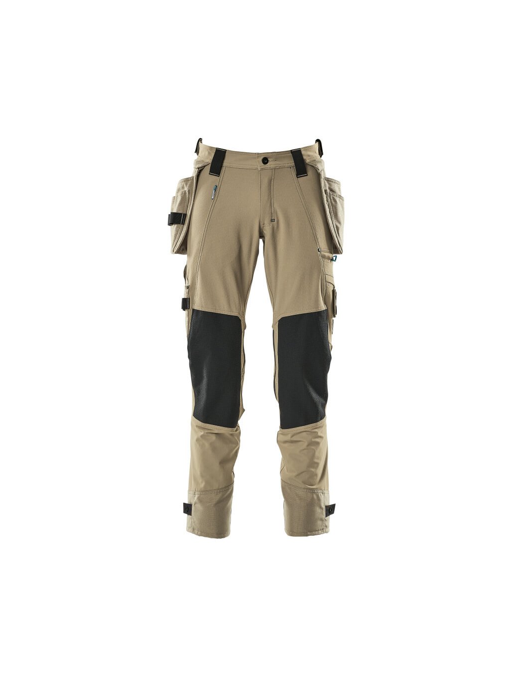 Strečová tkanina je pružná ve všech směrech a nabízí bezkonkurenční volnost pohybu, kdy nic netáhne ani nepřekáží; multifunkční strečová tkanina kombinuje nízkou hmotnost s velmi vysokou odolností a je také vodoodpudivá; dobře rozdělené závěsné kapsy z odolné tkaniny CORDURA® lze snadno odepnout pomocí zipu, když se nepoužívají, pro vyprázdnění nebo před praním kalhot.Elastické kapsy na kolena jsou vyrobeny z kombinace materiálů CORDURA®, Kevlar® a extrémně odolného vlákna Dyneema®; účinné odvětrávání oblasti kolen díky otvoru na zip na vnitřní straně nohavice; lepší viditelnost pro okolí díky reflexním efektům; pro optimální pohodlí doporučujeme zvolit tento chránič kolen 00718-100; certifikováno pro použití s chráničem kolen MASCOT typu SHORT nebo LONG, protože kapsa na chránič kolen je výškově nastavitelná.