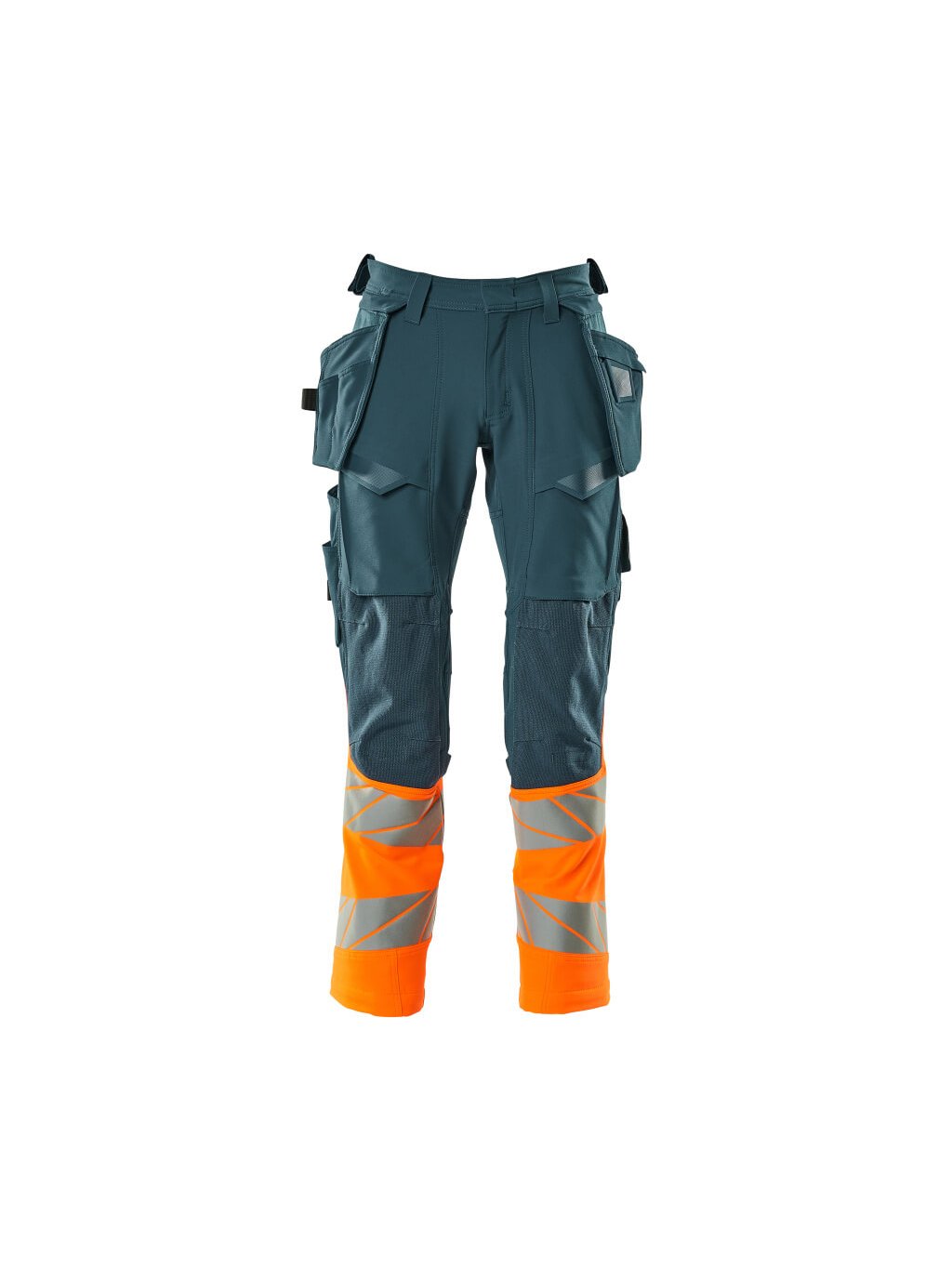 Fluorescenční kontrastní barva a odlesky. S vodoodpudivou úpravou. Dvoubarevné. Ultimátní strečová tkanina s nízkou hmotností a dobrou odolností. Dvojité prošití na nohavicích a v rozkroku. Skryté zapínání na knoflíky. Ergonomicky tvarované nohavice. Odnímatelné závěsné kapsy. Vnitřní závěsná kapsa se zapínáním na patentku. Závěsná kapsa s podšívkou na mobilní telefon a magnetickým zapínáním. Závěsné kapsy s výztuhami z materiálu Kevlar® a CORDURA®. Poutka na opasek. Poutka na nářadí na obou stranách pasu. Zapínání na zip. Přední kapsy. Zadní kapsy, vyztužené a s klopou. Skrytá poutka na kladivo na obou stranách. Knoflík (odnímatelný) pro připevnění pouzdra na nůž. Sklopná kapsa na pravidla s kevlarovými® výztuhami. Přední stehenní kapsy s klopou. Kolenní kapsy z obousměrně strečové tkaniny CORDURA® s odvětráváním. Jednoduché a individuální nastavení výšky kolenních kapes. Stehenní kapsa s podšívkou na mobilní telefon, magnetickým zapínáním a integrovaným držákem na průkaz totožnosti. Pouzdro na průkaz totožnosti je odnímatelné. Svislý zip pro větrání na zadní straně stehna. S potiskem efektů. Rozpínáním červeného švu na vnitřní straně konce nohavice lze prodloužit spodní šev o 3 cm. K tomuto modelu doporučujeme následující ochranu kolen: 00418-100, 00718-100, 50451-916 nebo 20118-915. Certifikováno společně s chráničem kolen typu SHORT nebo LONG podle normy EN 14404.
