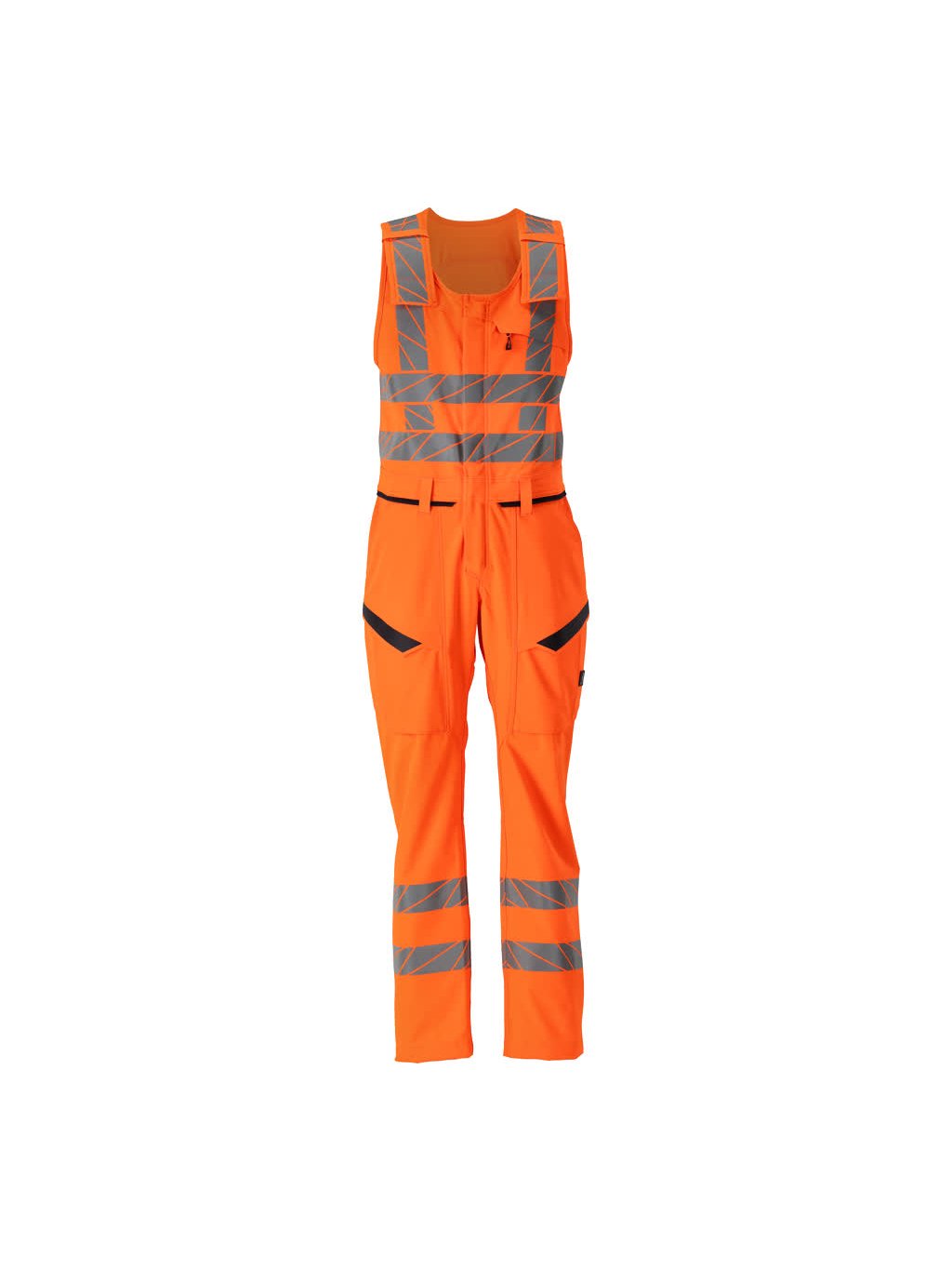 Fluorescenční s vertikální a horizontální reflexní páskou. Ultimátní strečová tkanina s nízkou hmotností a dobrou odolností. Polyester je vyroben z recyklovaných materiálů. S vodoodpudivou úpravou. Dvojité prošití na nohavicích a v rozkroku. Připraveno pro zavěšení kapes se systémem kapes click. Poutka na opasek. Zapínání na dvoucestný zip s dvojitou klopou proti nepříznivému počasí. Přední kapsy. Zesílené zadní kapsy. Přední stehenní kapsy s klopou. Náprsní kapsa na zip. Nastavitelné ramenní popruhy se zapínáním na suchý zip. Odvětrávání v zadní části. Rozpáráním červeného švu na vnitřní straně konce nohavic lze prodloužit vnitřní šev o 3 cm.