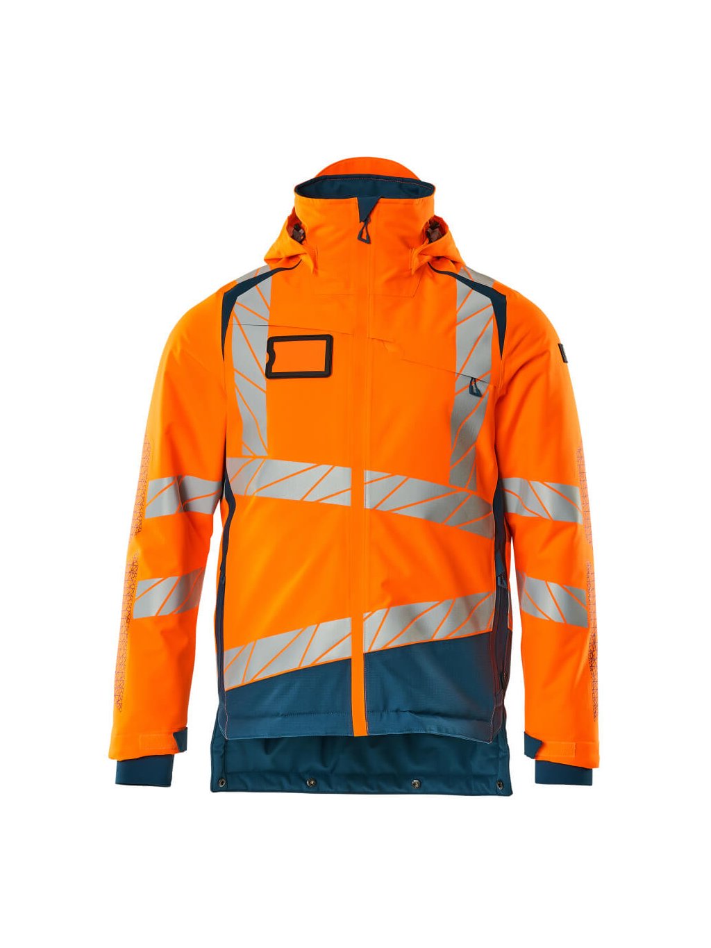 Fluorescenční a s reflexními pruhy na ramenou a diagonálními reflexními prvky. Vysoce odolná, prodyšná, větruodolná a nepromokavá tkanina. S lehkou izolací CLIMASCOT®. Dvoubarevné provedení. Podlepené švy. Odnímatelná, podšitá kapuce s nastavitelnými elastickými šňůrkami. Zapínání na zip a dvojitý ochranný pruh proti povětrnostním vlivům. Vnitřní kapsy - dvě na zip a jedna otevřená síťovaná kapsa. Odnímatelné pouzdro na průkaz totožnosti. Náprsní kapsa s voděodolným zipem. Přední kapsy s voděodolnými zipy. Stojatý límec. Žebrovaný pas na přední straně, spodní vnitřní lem. Rozšiřitelný zadní díl na knoflíky pro lepší ochranu před větrem a nepříznivým počasím. Žebrované manžety (skryté pod légou proti povětrnostním vlivům) na zápěstí. Zapínání na suchý zip na zápěstí. Zip v podšívce na zadní straně pro připevnění loga/výšivky. S potiskem s efekty.