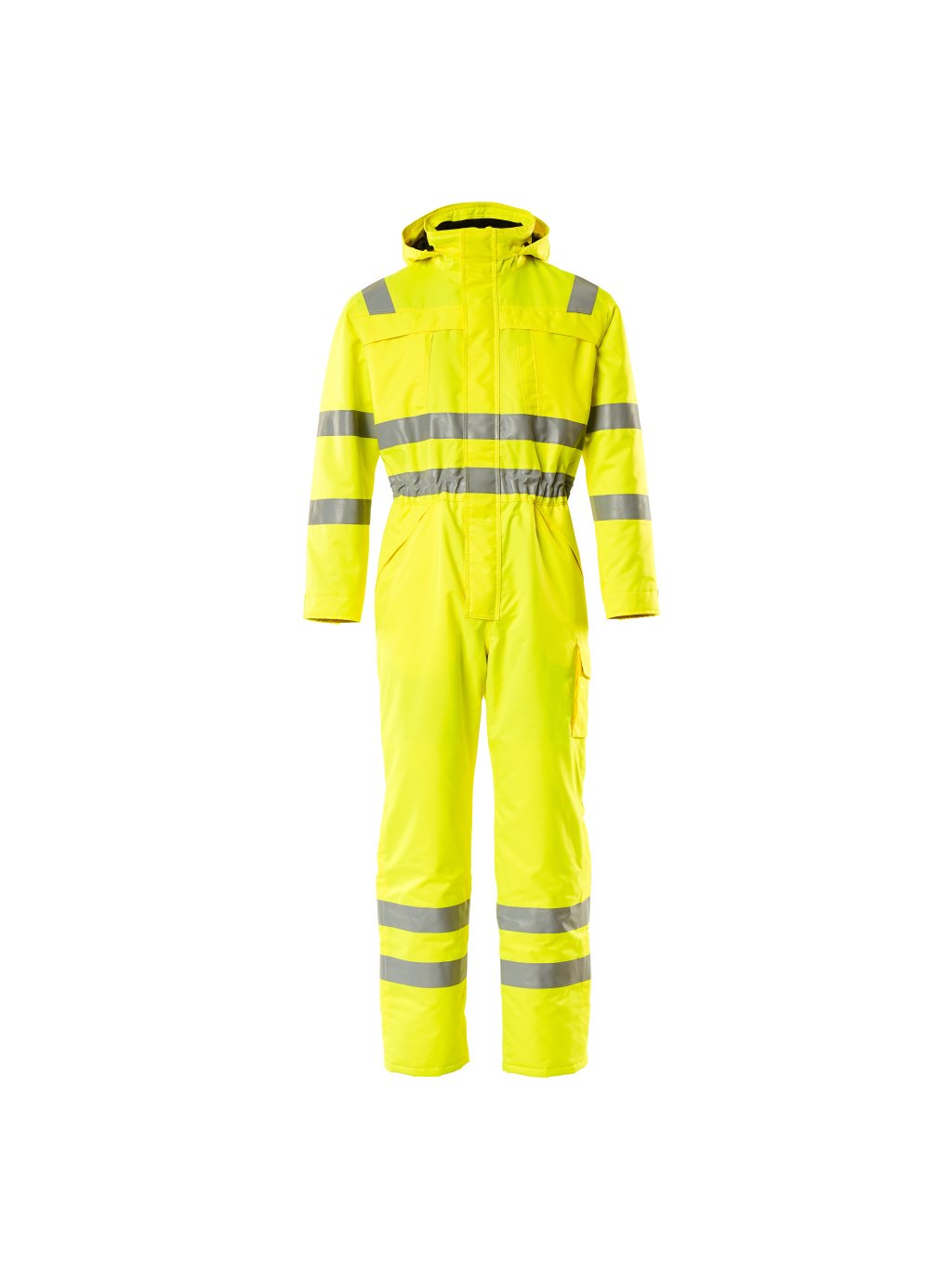 Fluorescenční s vertikální a horizontální reflexní páskou. Prodyšná, větruodolná a nepromokavá. Podlepené švy. Dvojité prošití na nohavicích a v rozkroku. Podšívka z umělé kožešiny na těle. Prošívaná podšívka na nohavicích a rukávech. Odnímatelná, podšitá kapuce s nastavitelnými elastickými šňůrkami. Zapínání na dvoucestný zip, pruh chránící před povětrnostními vlivy a patentky. Náprsní kapsy s klopou a zapínáním na suchý zip. Náprsní kapsa na mobilní telefon na zip. D-kroužek. Kapsa na tužky. Přední kapsy s klopou chránící před povětrnostními vlivy. Vnitřní kapsy - jedna na zip a jedna na suchý zip. Elastická (skrytá) zadní část. Zadní kapsy s výztuhami a klopou se zapínáním na suchý zip. Stehenní kapsa s klopou a zapínáním na suchý zip. Skládací kapsa na pravidla. Zip s ochranným pruhem proti povětrnostním vlivům na vnějším konci nohavice. Žebrované manžety (skryté pod légou proti povětrnostním vlivům) a zapínání na patentky na zápěstí.